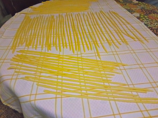Farina di grano duro, acqua quanto basta (impasto duro), riposa mezz’ora, fare rotoli come grissino, taglia a pezzi di 5 cm, filo di paglia o ferro da cucire arrotola insieme e allunga all estremità. Metto stesi ad