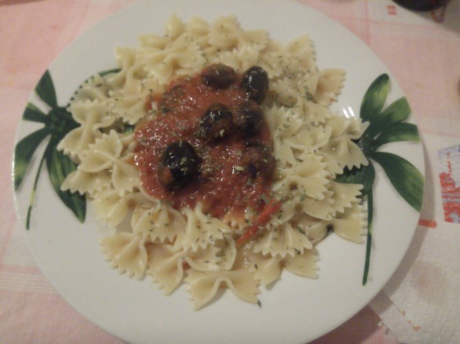 Farfalle con sugo al basilico, olive, aglio e peperoncino