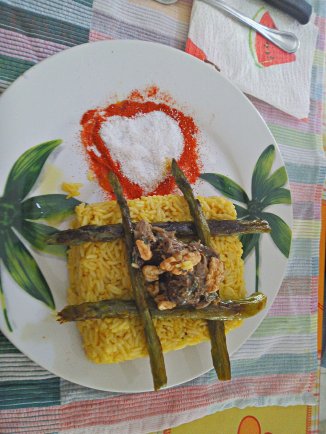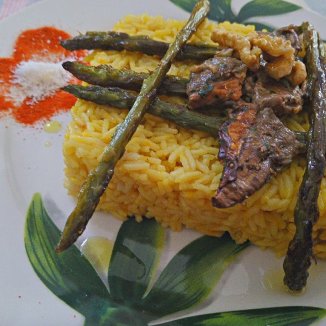 Cubo di basmati con zafferano, noci, asparagi in padella con aglio e scorza di limone.