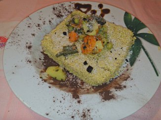 Primo e unico piatto con Miglio cotto nel latte di riso, verdure scottate. Impiattate sul cacao
