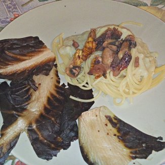 Ho sofferto un po’ e in attesa ho messo in padella aglio e veg wurstel, radicchio e Champignon, curcuma fresca e noci. Poi ho ubriacato tutto con vino bianco. Ho aggiunto la besciamella di soia. Sono approdato con gli spaghetti, cosparso di peperoncino, pepe e prezzemolo. La mia lingua scivola sul tuo corpo finché non trova il tuo inguine umido.