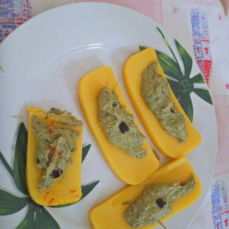 Hummus di piselli e zucchina, cipolla rossa di tropea.