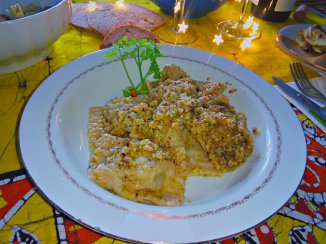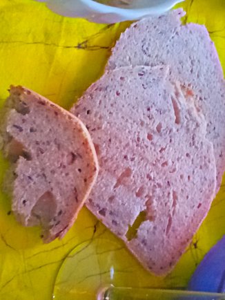 Ciambella di farina di castagne, cacao, yogurt di more di soia, banana schiacciata, zucchero di canna, cocco in polvere e noci, due bicchieri di sangiovese e acqua,lievito.